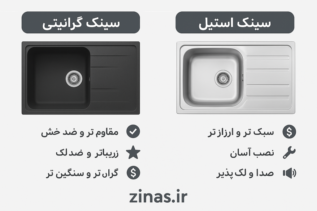 مقایسه سینک گرانیتی و استیل – کدام برای آشپزخانه شما بهتر است؟
